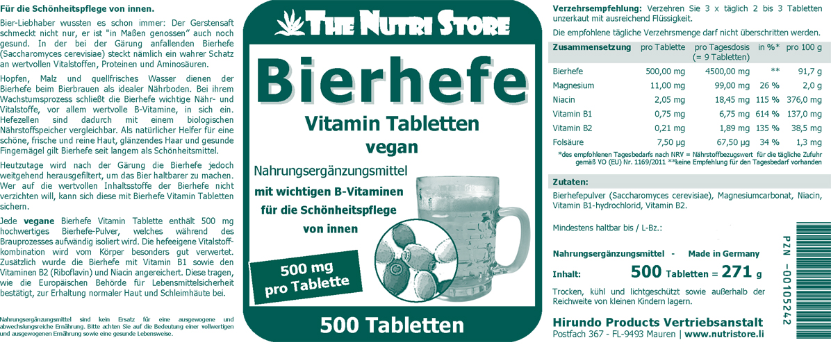 Jede Bierhefe Vitamin Tablette enthält 500 mg hochwertiges Bierhefe-Pulver, welches während des Brauprozesses aufwändig isoliert wird. Die hefeeigene Vitalstoffkombination wird vom Körper besonders gut verwertet. Zusätzlich wurde die Bierhefe mit Vitamin B1 sowie den Vitaminen B2 (Riboflavin) und Niacin angereichert. Diese tragen, wie die Europäischen Behörde für Lebensmittelsicherheit bestätigt, zur Erhaltung normaler Haut und Schleimhäute bei.