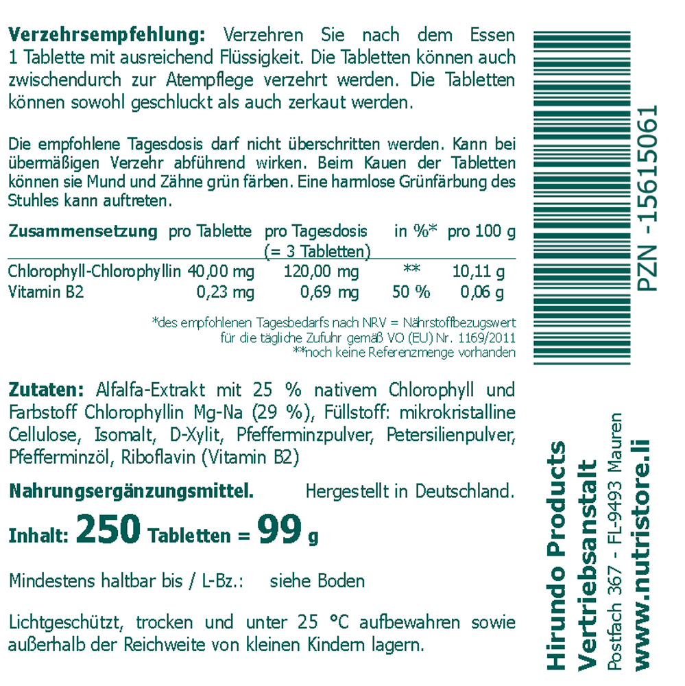 Zutaten: Alfalfa-Extrakt mit 25 % nativem Chlorophyll und Farbstoff Chlorophyllin Mg-Na (29 %), Füllstoff: mikrokristalline Cellulose, Isomalt, D-Xylit, Pfefferminzpulver, Petersilienpulver, Pfefferminzöl, Vitamin B2 Kann bei übermäßigen Verzehr abführend wirken.