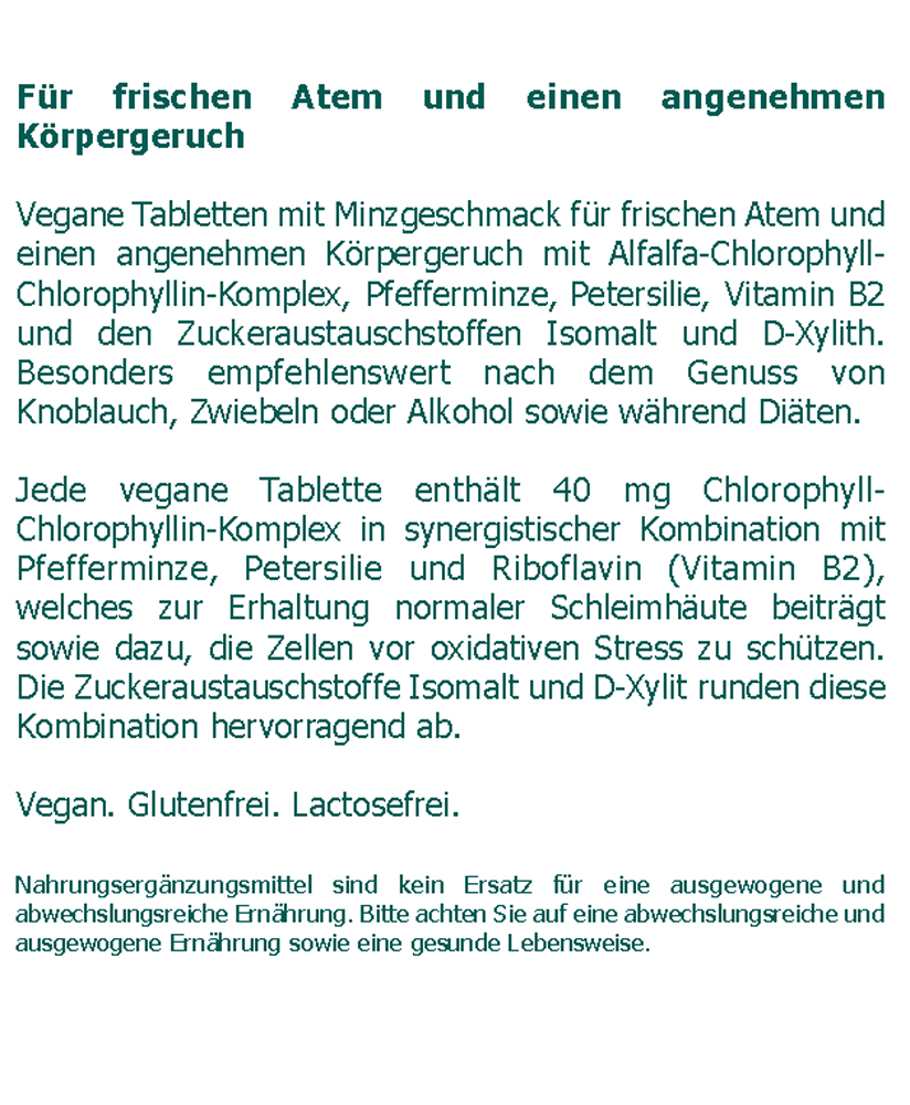 Vegane Tabletten mit Minzgeschmack für frischen Atem und einen angenehmen Körpergeruch mit Alfalfa- Chlorophyll-Chlorophyllin-Komplex, Pfefferminze, Petersilie, Vitamin B2 und den Zuckeraustauschstoffen Isomalt und D-Xylith. Besonders empfehlenswert nach dem Genuss von Knoblauch, Zwiebeln oder Alkohol sowie während Diäten.