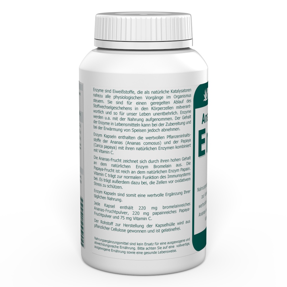 Enzym Kapseln enthalten die wertvollen Pflanzeninhaltsstoffe der Ananas (Ananas comosus) und der Papaya (Carica papaya) mit ihren natürlichen Enzymen kombiniert mit Vitamin C.