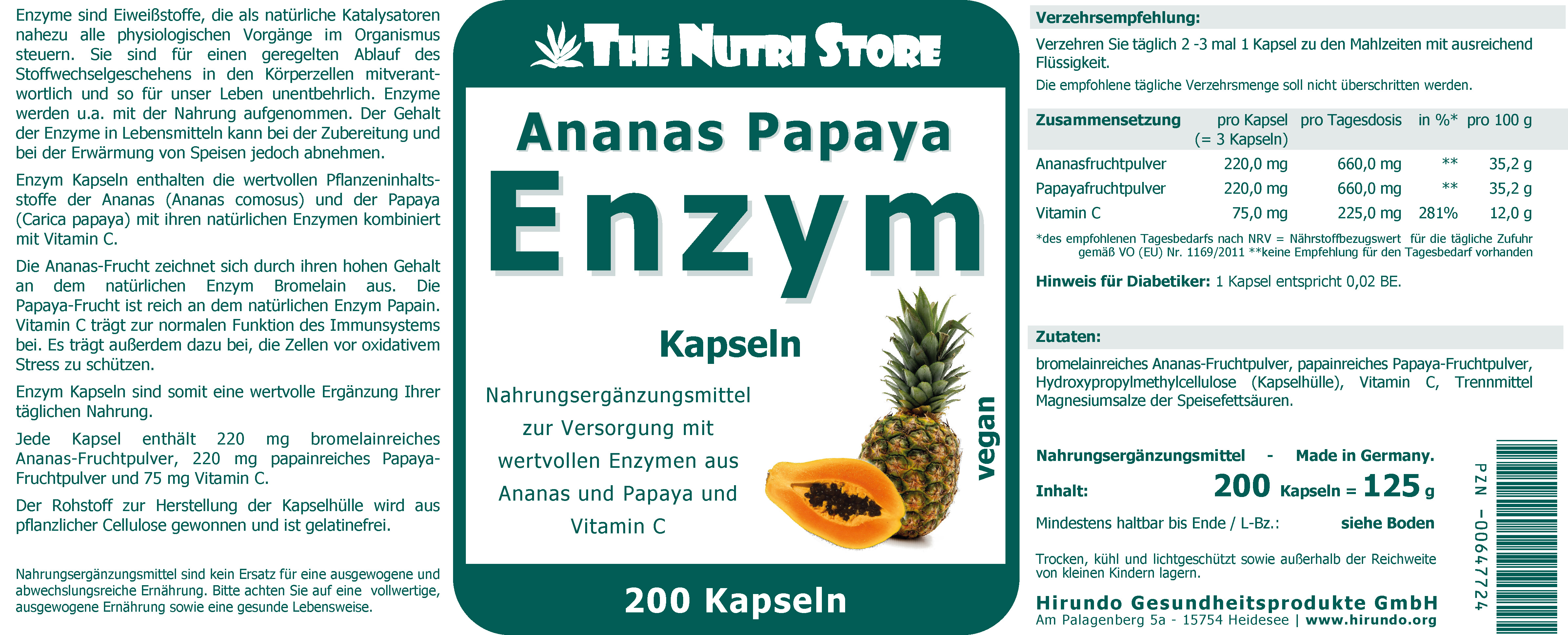 Zutaten: bromelainreiches Ananas-Fruchtpulver, papainreiches Papaya-Fruchtpulver, Kapselhülle: Hydroxypropylmethylcellulose, Vitamin C, Trennmittel Magnesiumstearat