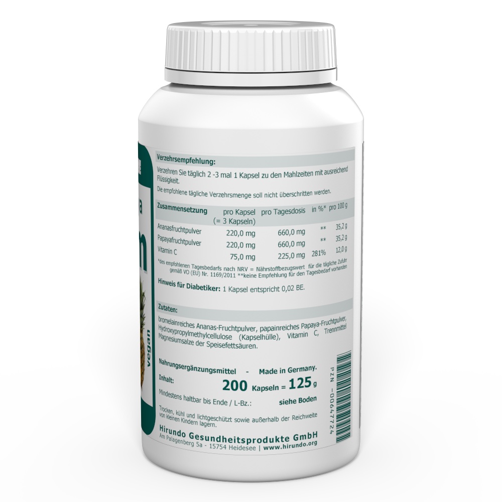 Jede Kapsel enthält 220 mg bromelain-reiches Ananas-Fruchtpulver, 220 mg papain-reiches Papaya-Fruchtpulver und 75 mg Vitamin C.
