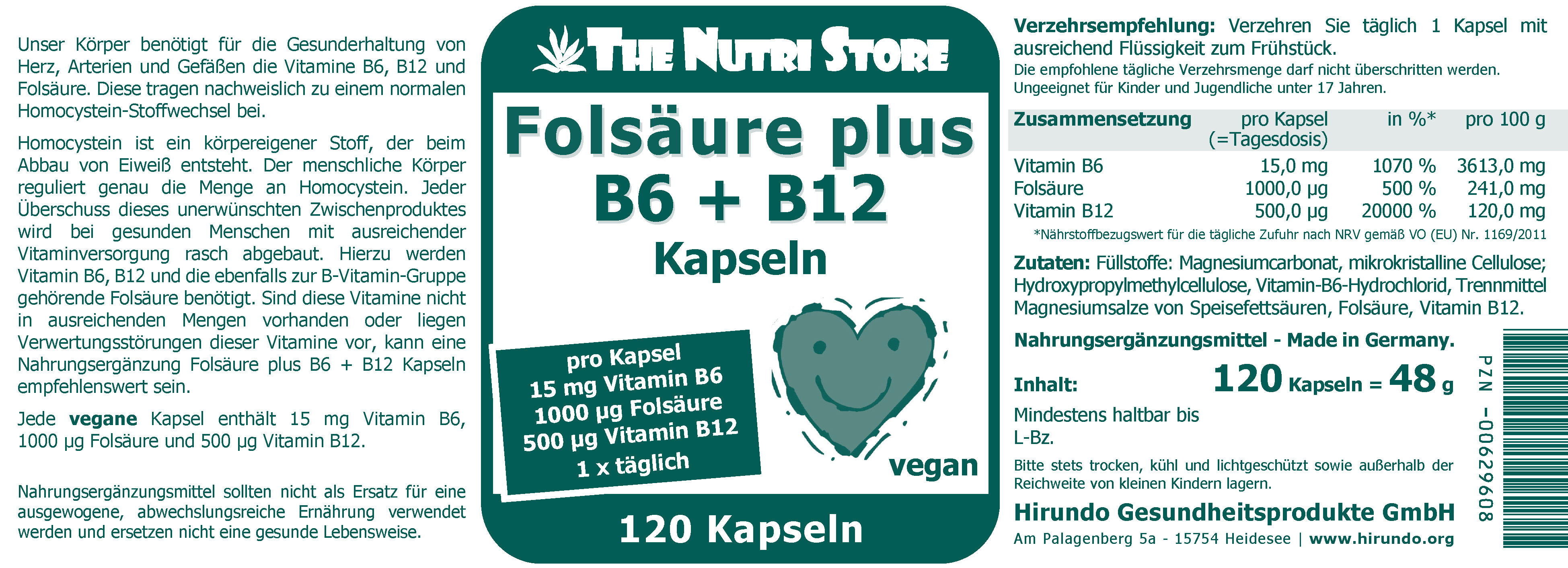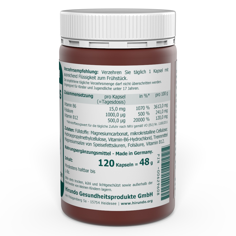 Jede Kapsel enthält eine hochdosierte Kombination aus drei B-Vitaminen: 15 mg Vitamin B6, 1000 µg Folsäure und 500 µg Vitamin B12. Das Produkt enthält 120 Kapseln pro Dose und reicht bei der empfohlenen Einnahme für 4 Monate.