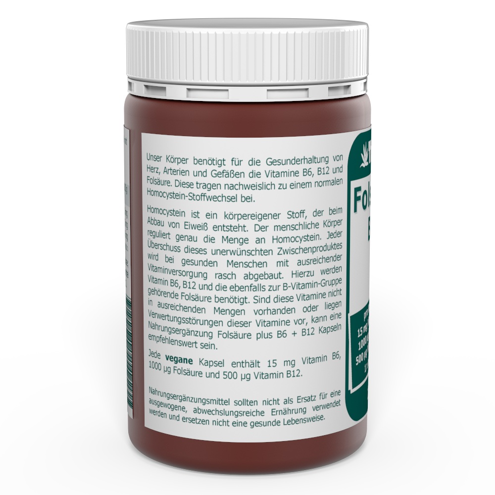 Homocystein ist ein körpereigener Stoff, der beim Abbau von Eiweiß entsteht. Der menschliche Körper reguliert genau die Menge an Homocystein. Jeder Überschuss dieses unerwünschten Zwischenproduktes wird bei gesunden Menschen mit ausreichender Vitaminversorgung rasch abgebaut. Hierzu werden Vitamin B6, B12 und die ebenfalls zur B-Vitamin-Gruppe gehörende Folsäure benötigt. Sind diese Vitamine nicht in ausreichenden Mengen vorhanden oder liegen Verwertungsstörungen dieser Vitamine vor, kann eine Nahrungsergänzung Folsäure plus B6 + B12 Kapseln empfehlenswert sein.