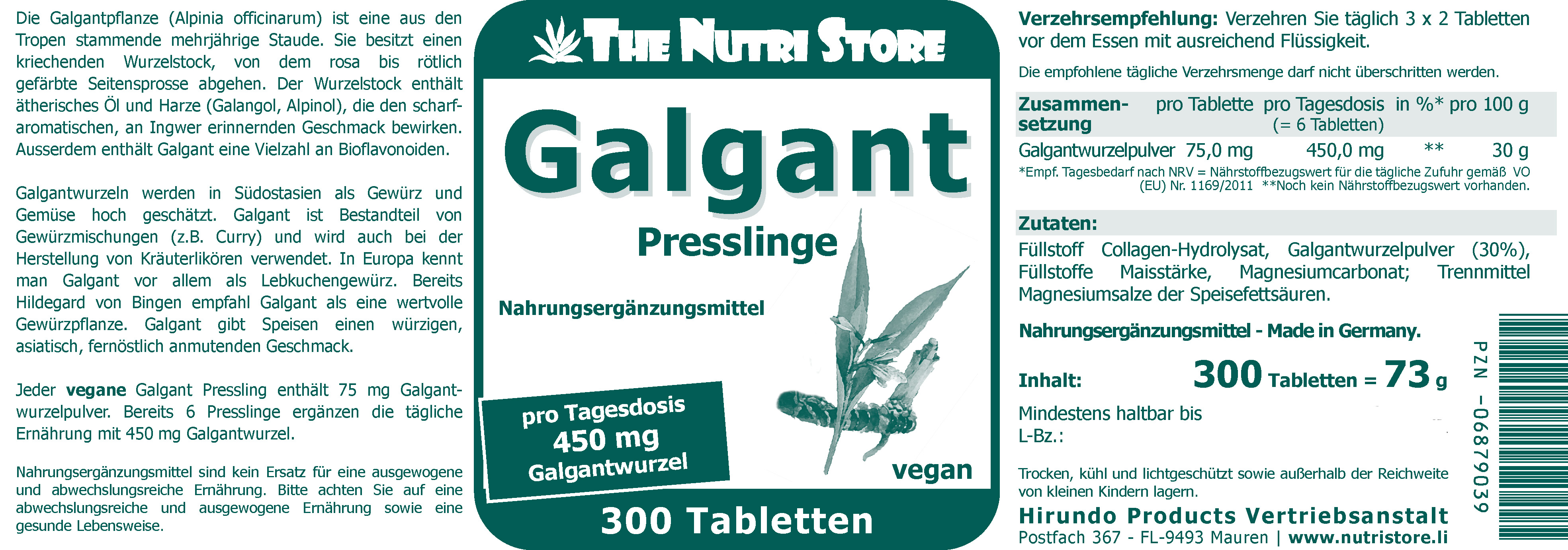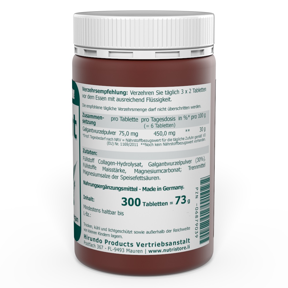 Zutaten: Füllstoff Collagen-Hydrolysat, Galgantwurzelpulver (30%), Füllstoffe Maisstärke, Magnesiumcarbonat; Trennmittel Magnesiumsalze der Speisefettsäuren.