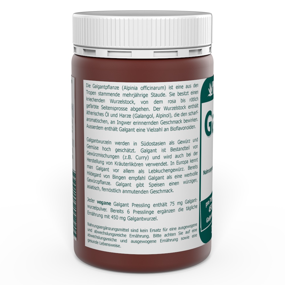 Jeder vegane Galgant Pressling enthält 75 mg Galgantwurzelpulver. Bereits 6 Presslinge ergänzen die tägliche Ernährung mit 450 mg Galgantwurzel.