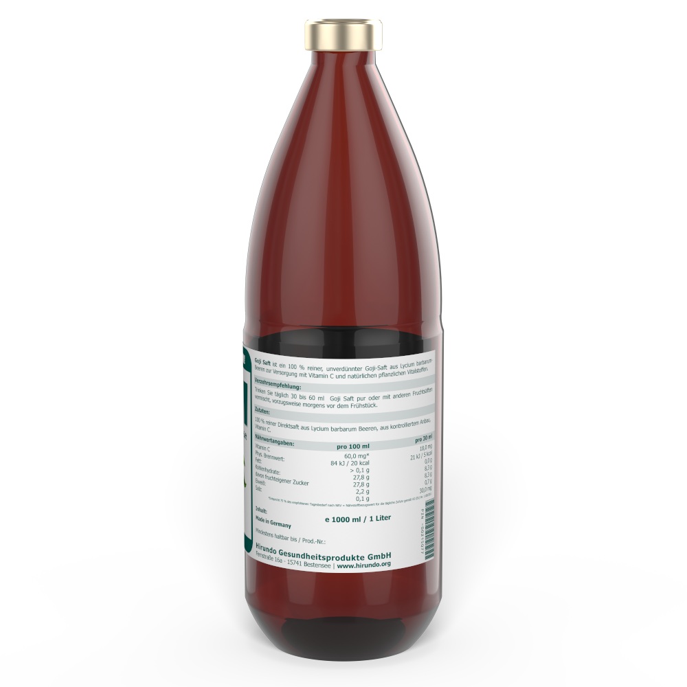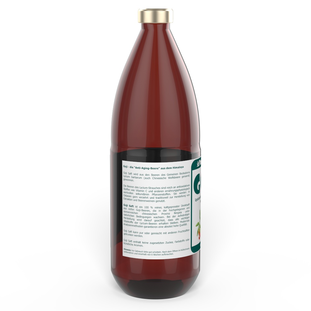 Goji Saft ist ein 100 % reiner, unverdünnter Goji-Saft aus Lycium barbarum-Beeren zur Versorgung mit Vitamin C und natürlichen pflanzlichen Vitalstoffen.