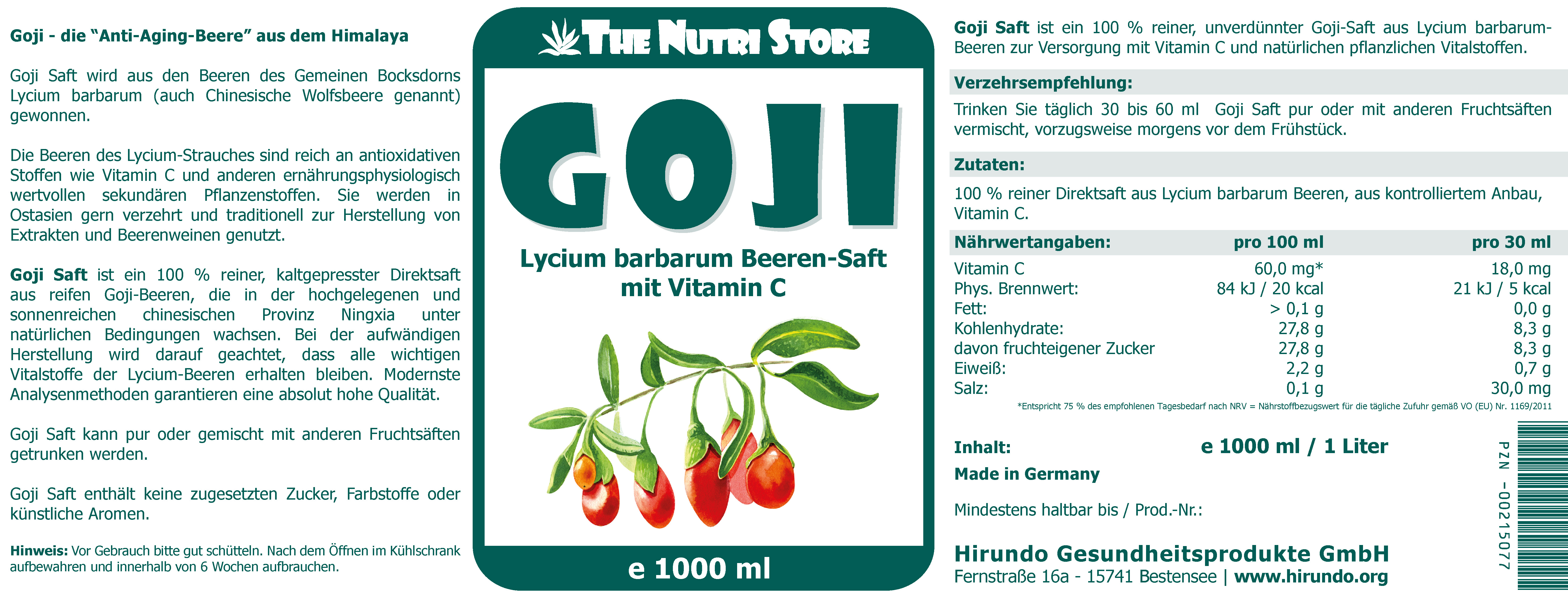 Zutaten: 100 % reiner Direktsaft aus Lycium barbarum Beeren, aus kontrolliertem Anbau, Vitamin C