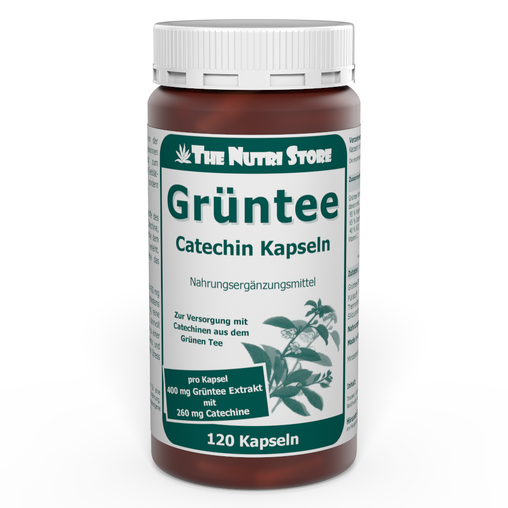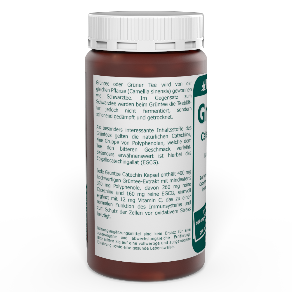 Jede Grüntee Catechin Kapsel enthält 400 mg hochwertigen Grüntee-Extrakt mit mindestens 380 mg Polyphenolen, davon 247 mg reine Catechine und 99 mg reine EGCG, sinnvoll ergänzt mit 12 mg Vitamin C.
