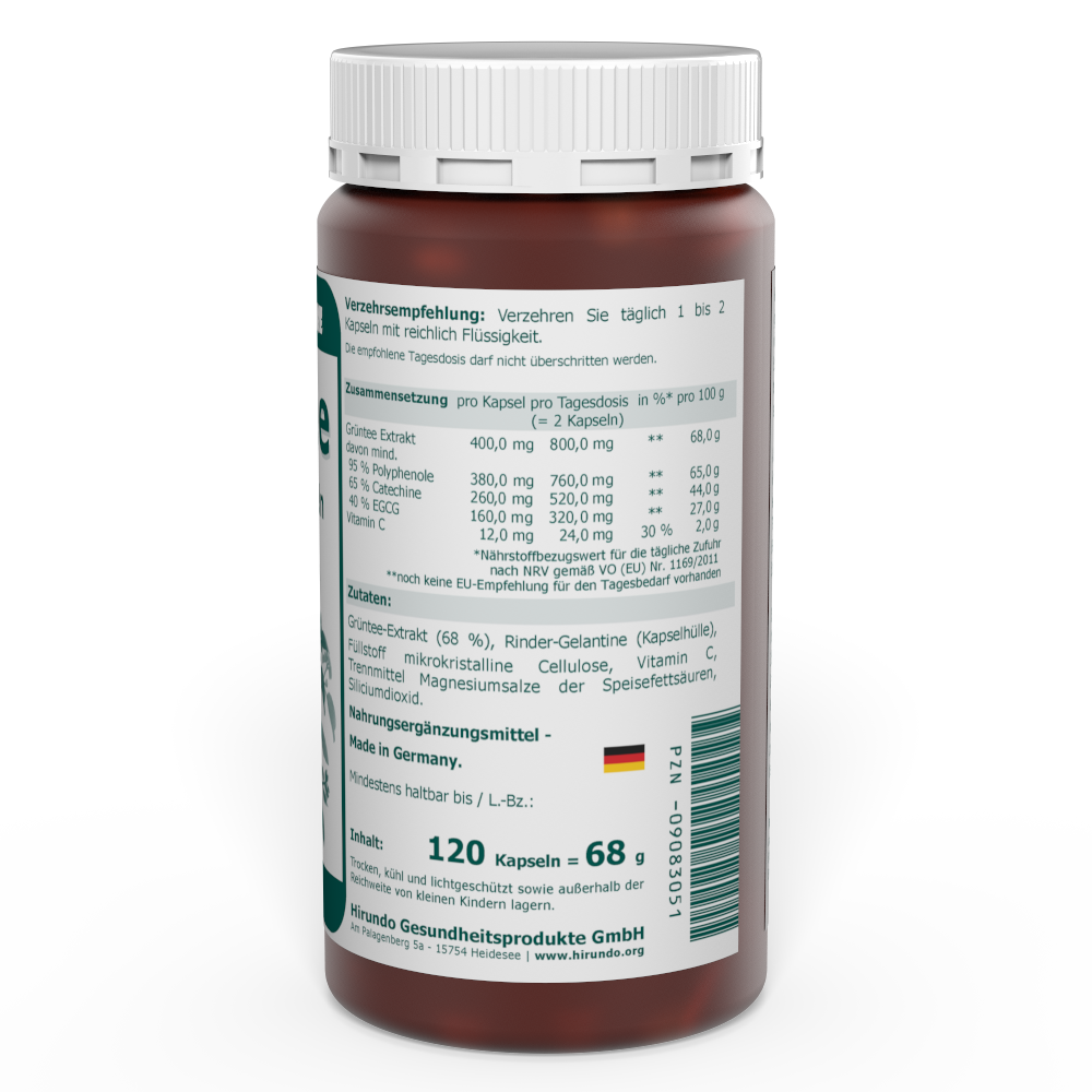 Zutaten: Grüntee-Extrakt (68 %), Füllstoff mikrokristalline Cellulose, Rinder-Gelatine (Kapselhülle), Vitamin C, Trennmittel Magnesiumstearat, Siliciumdioxid.