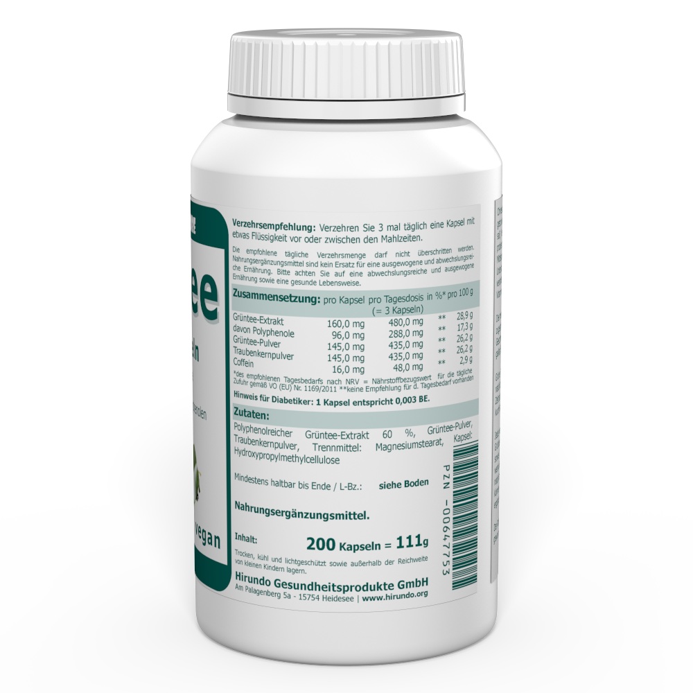 Zutaten: polyphenolreicher Grüntee-Extrakt 60 %, Grüntee-Pulver, Traubenkernpulver, Trennmittel: Magnesiumstearat, Kapsel: Hydroxypropylmethylcellulose