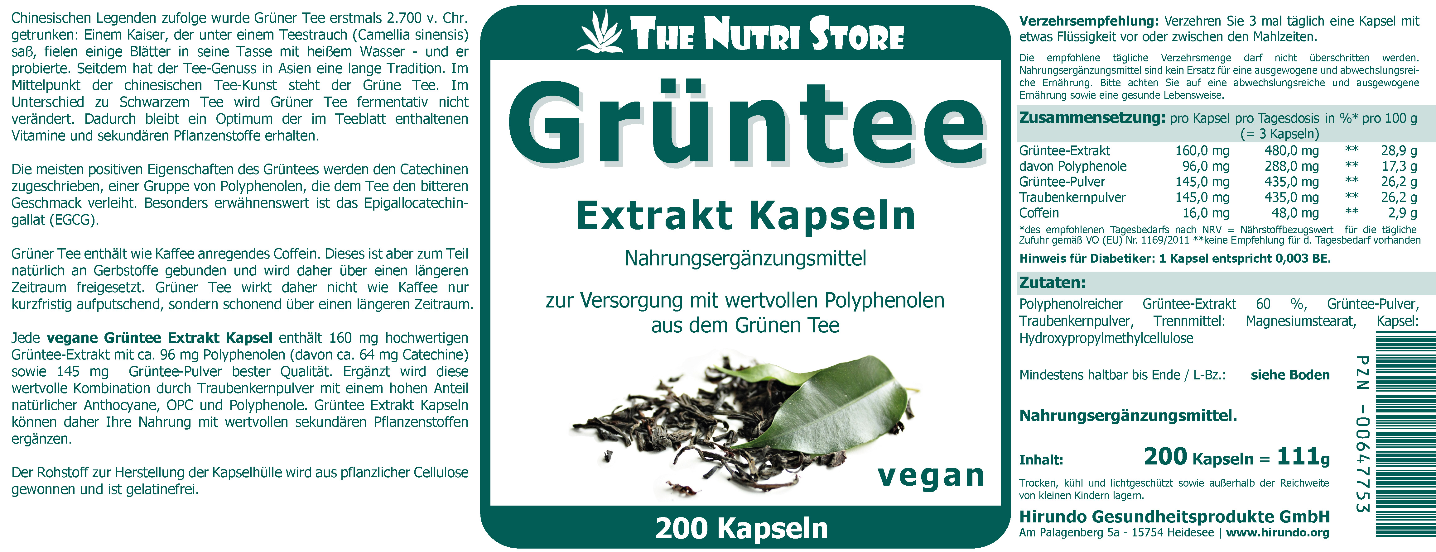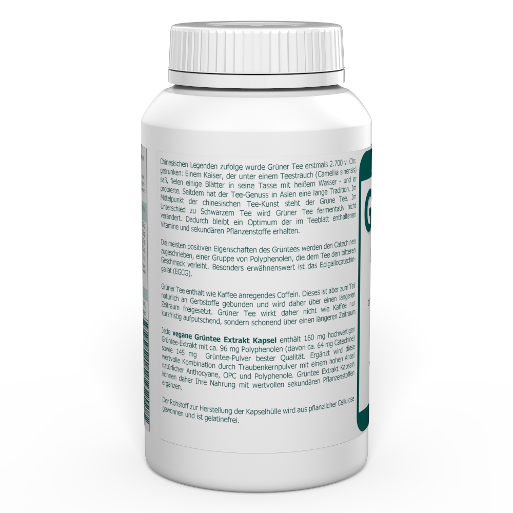 Jede vegane Grüntee Extrakt Kapsel enthält 160 mg hochwertigen Grüntee-Extrakt mit ca. 96 mg Polyphenolen (davon ca. 64 mg Catechine) sowie 145 mg Grüntee-Pulver bester Qualität. Ergänzt wird diese wertvolle Kombination durch Traubenkernpulver mit einem hohen Anteil natürlicher Anthocyane, OPC und Polyphenole. Grüntee Extrakt Kapseln können daher Ihre Nahrung mit wertvollen sekundären Pflanzenstoffen ergänzen.