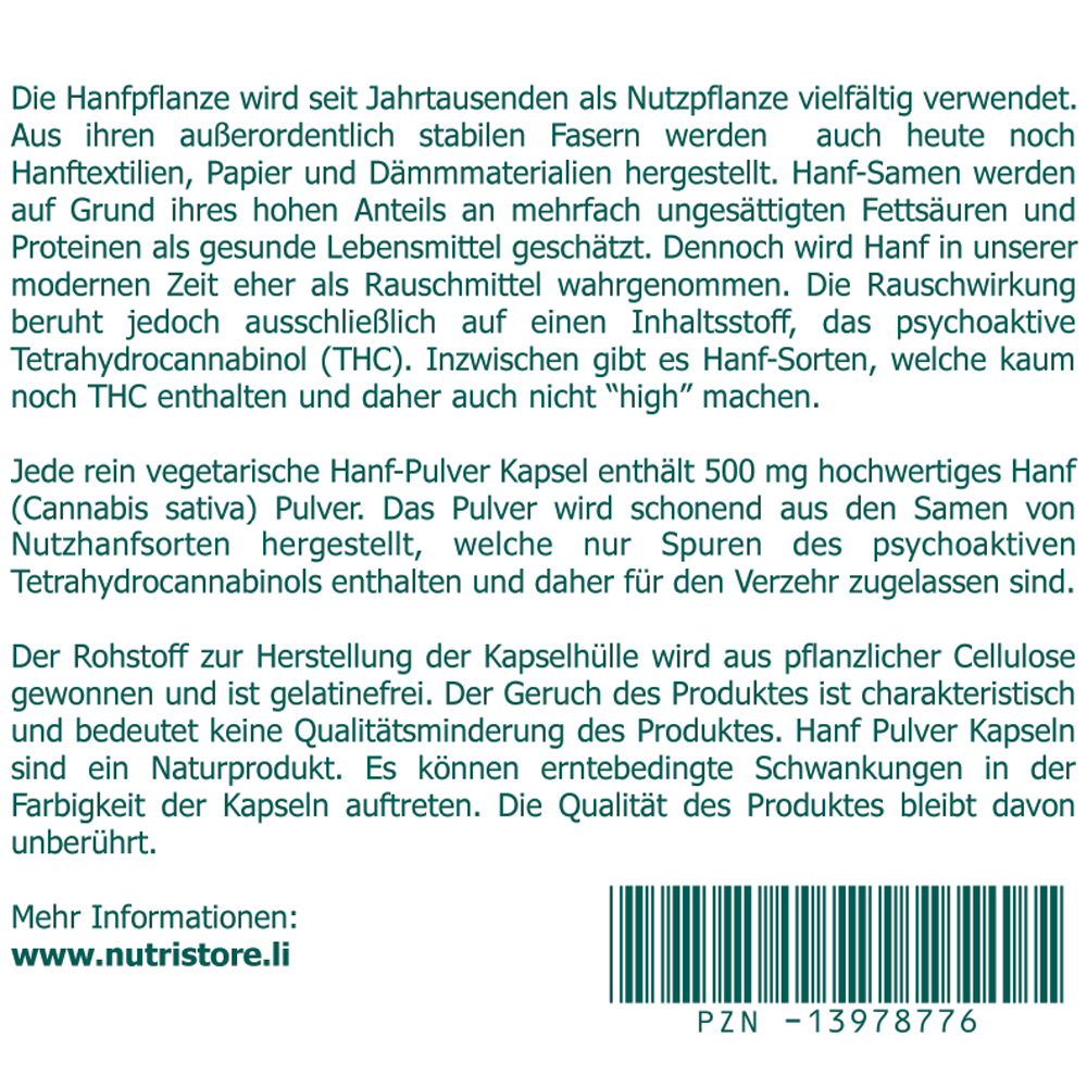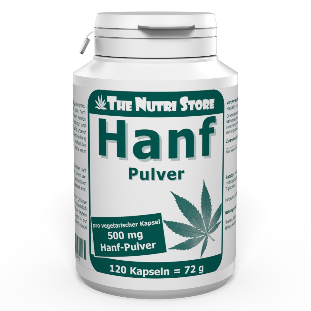 Jede rein vegetarische Hanf-Pulver Kapsel enthält 500 mg hochwertiges Hanf (Cannabis sativa) Pulver. Das Pulver wird schonend aus den Samen von Nutzhanfsorten hergestellt, welche nur Spuren des psychoaktiven Tetrahydrocannabinols enthalten und daher für den Verzehr zugelassen sind.