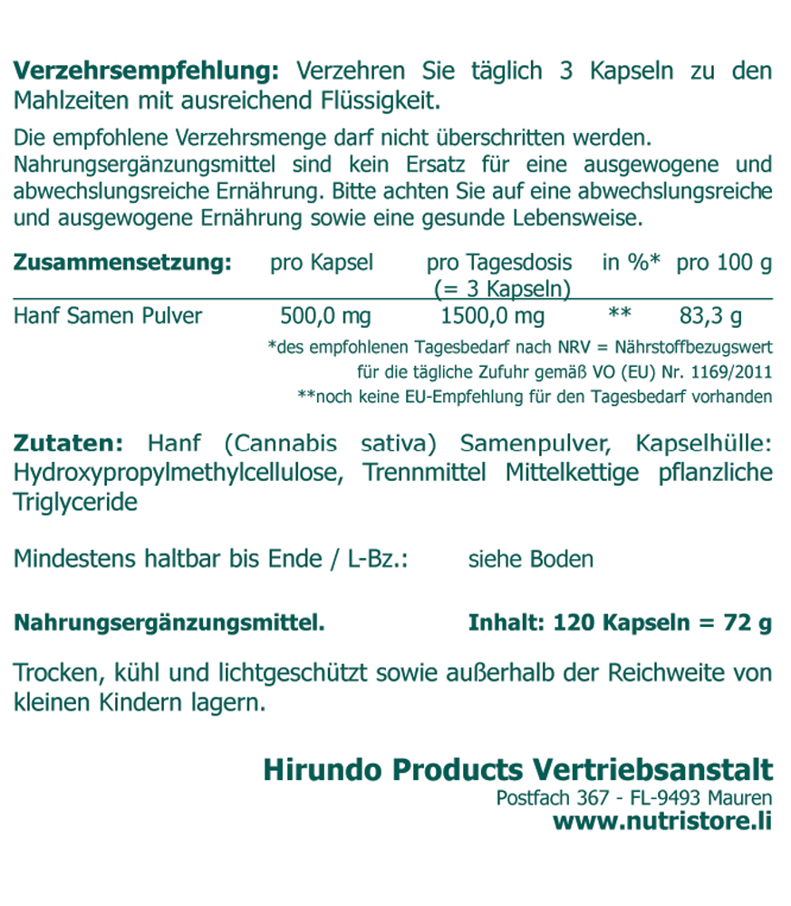 Zutaten: Hanf (Cannabis sativa) Samenpulver, Kapselhülle: Hydroxypropylmethylcellulose, Trennmittel Mittelkettige pflanzliche Triglyceride