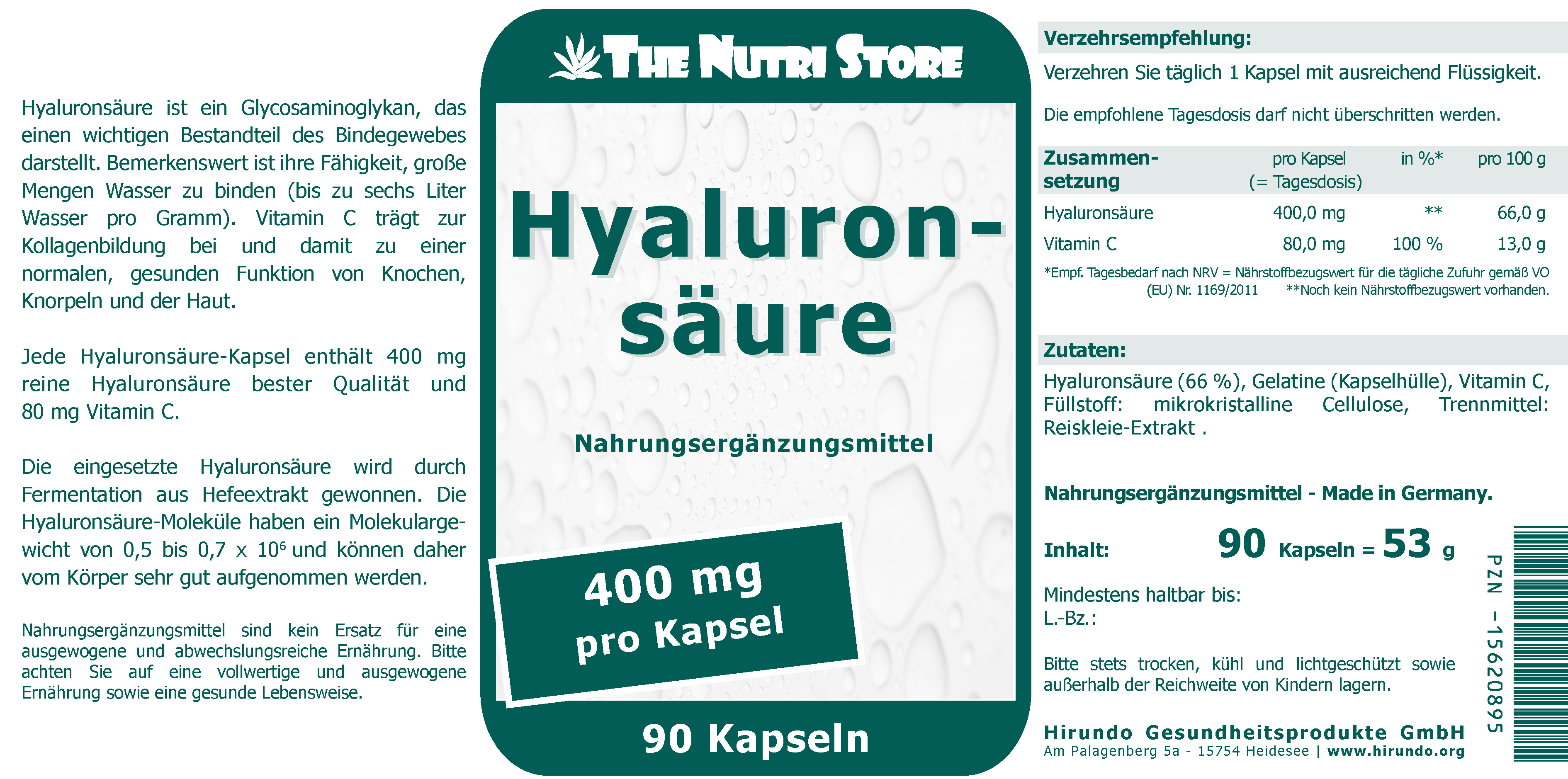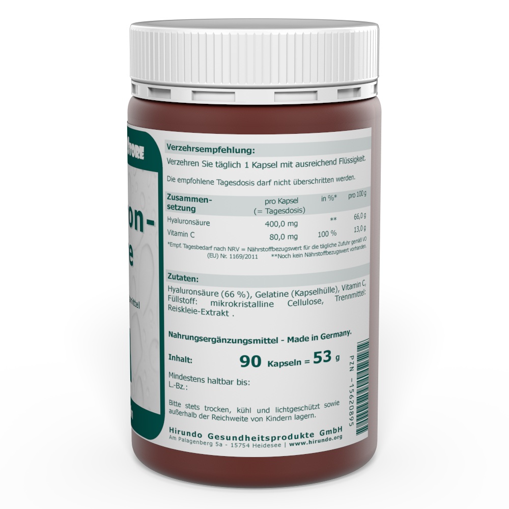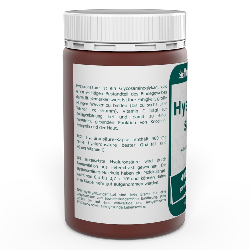Jede Hyaluronsäure-Kapsel enthält 400 mg reine Hyaluronsäure bester Qualität und 80 mg Vitamin C. Die eingesetzte Hyaluronsäure wird durch Fermentation aus Hefeextrakt gewonnen. Die Hyaluronsäure-Moleküle haben ein Molekulargewicht von 0,5-0,7 x 106 und können daher vom Körper sehr gut aufgenommen werden.