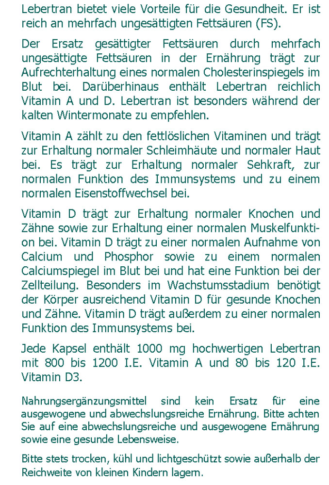 Jede Kapsel enthält 1000 mg hochwertigen Lebertran mit 800 bis 1200 I.E. Vitamin A und 80 bis 120 I.E. Vitamin D3.