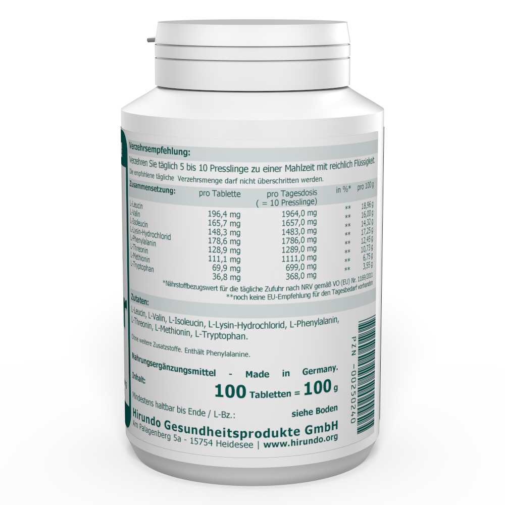 Zutaten: L-Leucin, L-Valin, L-Threonin, L-Lysin-Hydrochlorid, L-Isoleucin, L-Methionin, L-Phenylalanin, L-Tryptophan