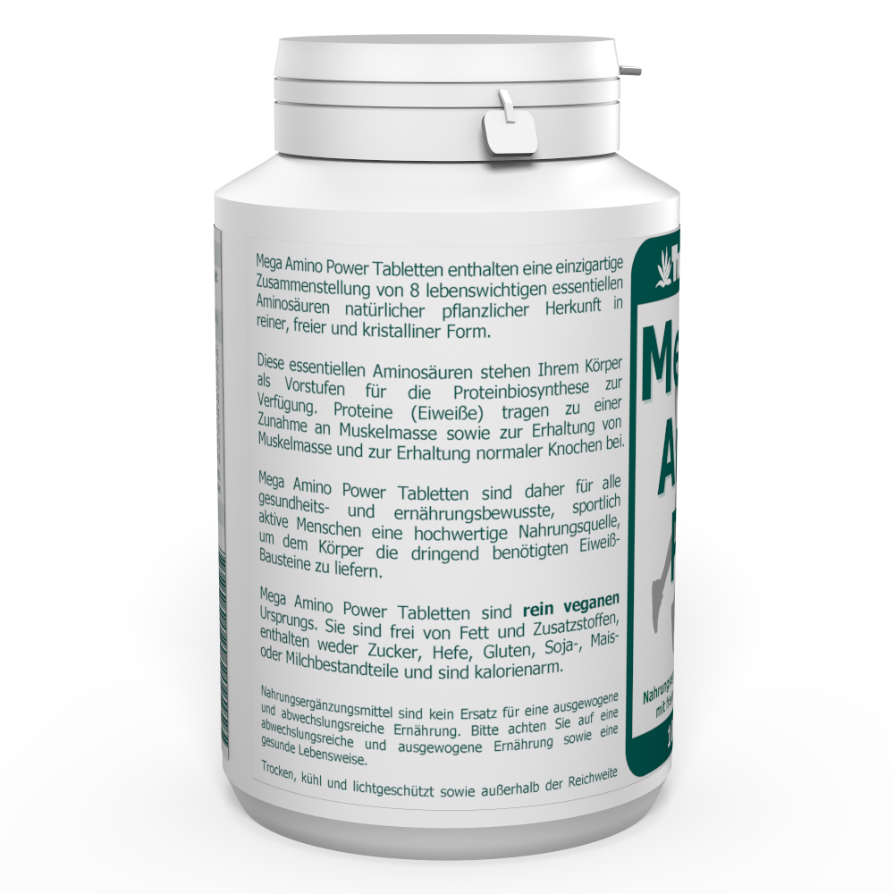 Mega Amino Power Tabletten enthalten eine einzigartige Zusammenstellung von 8 lebenswichtigen essentiellen Aminosäuren natürlicher pflanzlicher Herkunft in reiner, freier und kristalliner Form.