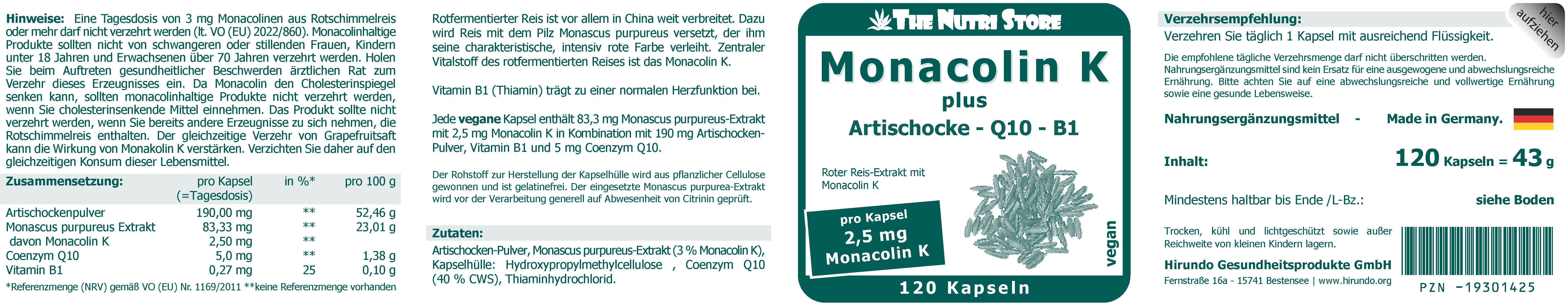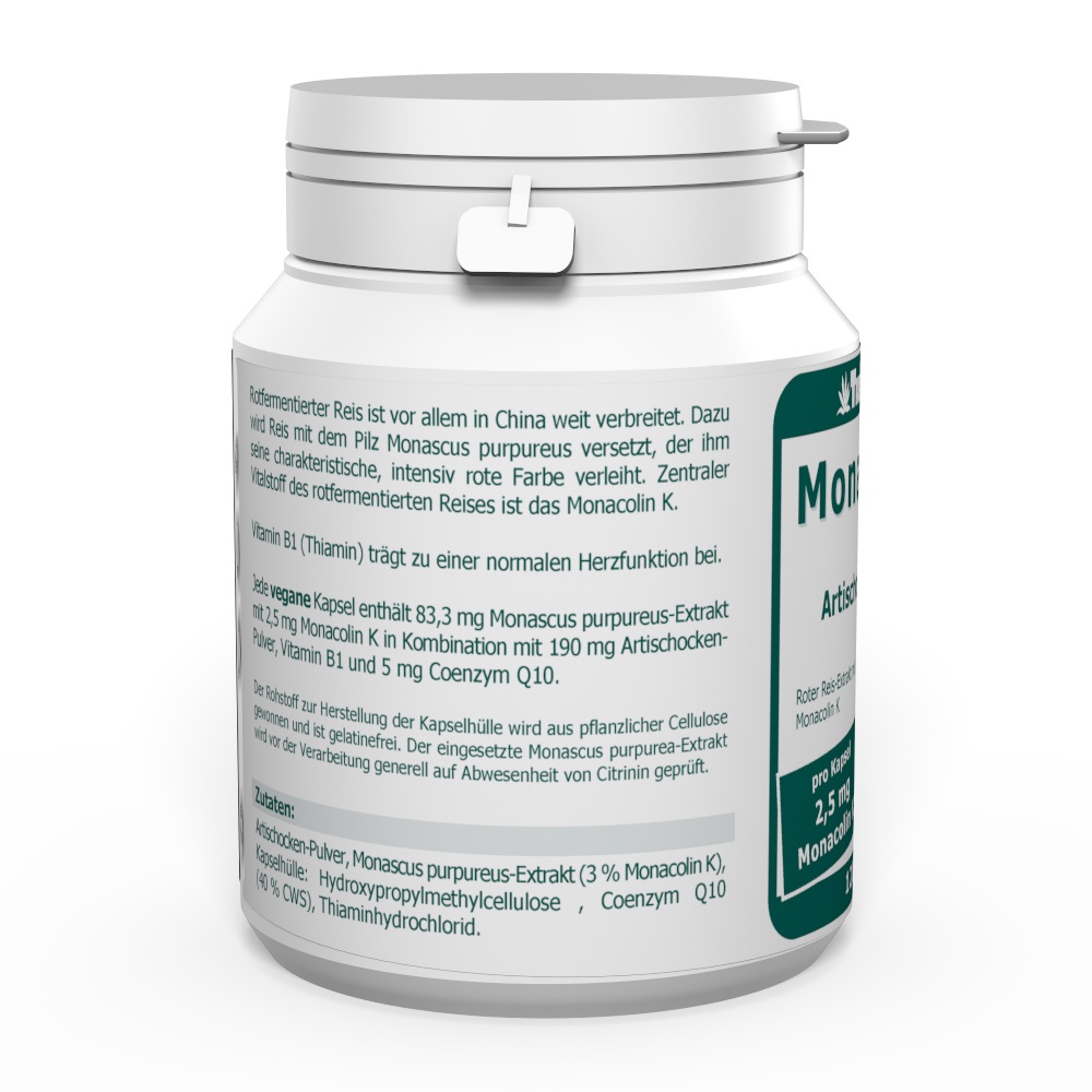 Jede vegane Kapsel enthält 83,3 mg Monascus purpureus-Extrakt mit 2,5 mg Monacolin K in Kombination mit 190 mg ArtischockenPulver, Vitamin B1 und 5 mg Coenzym QlO.