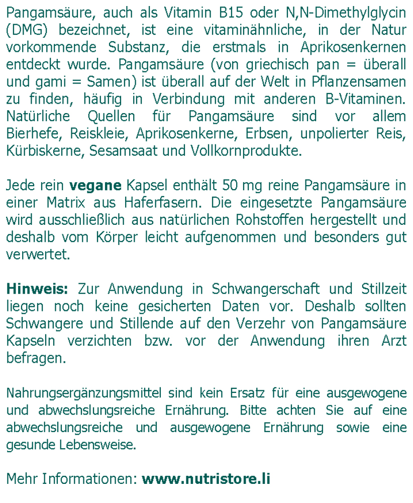 Jede rein vegane Kapsel enthält 50 mg reine Pangamsäure in einer Matrix aus Haferfasern. Die eingesetzte Pangamsäure wird ausschließlich aus natürlichen Rohstoffen hergestellt und deshalb vom Körper leicht aufgenommen und besonders gut verwertet.