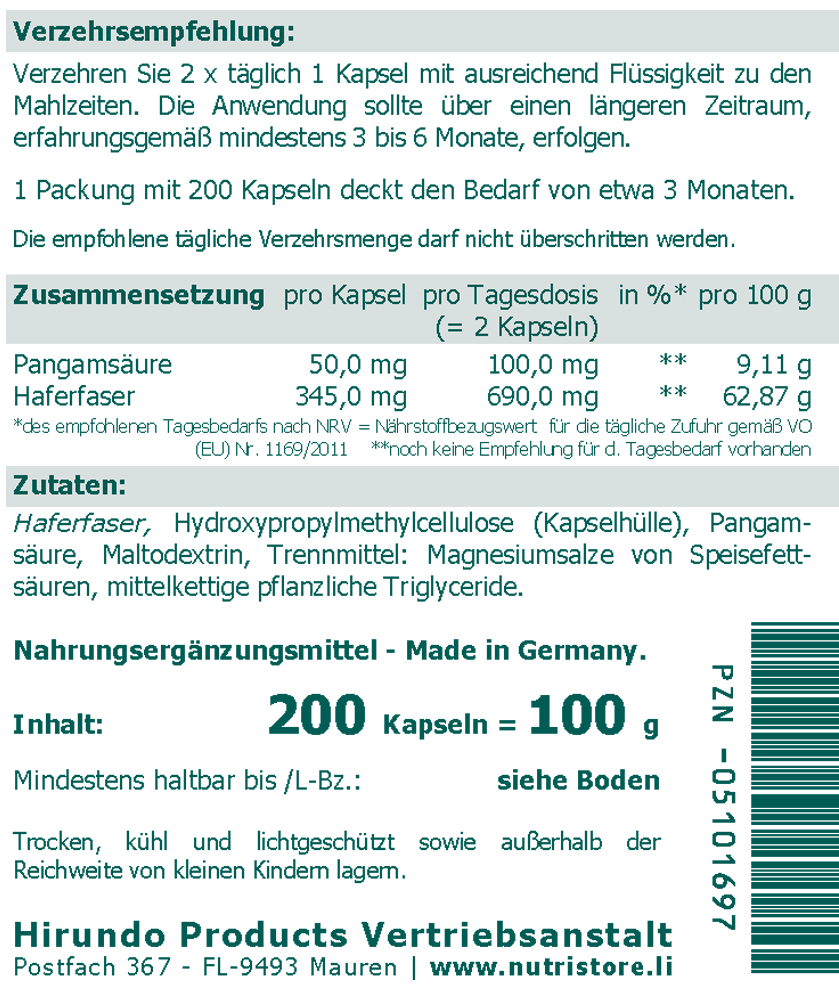 Zutaten: Haferfaser, Hydroxypropylmethylcellulose (Kapselhülle), Pangamsäure, Maltodextrin, Trennmittel: Magnesiumsalze von Speisefettsäuren, mittelkettige pflanzliche Triglyceride.