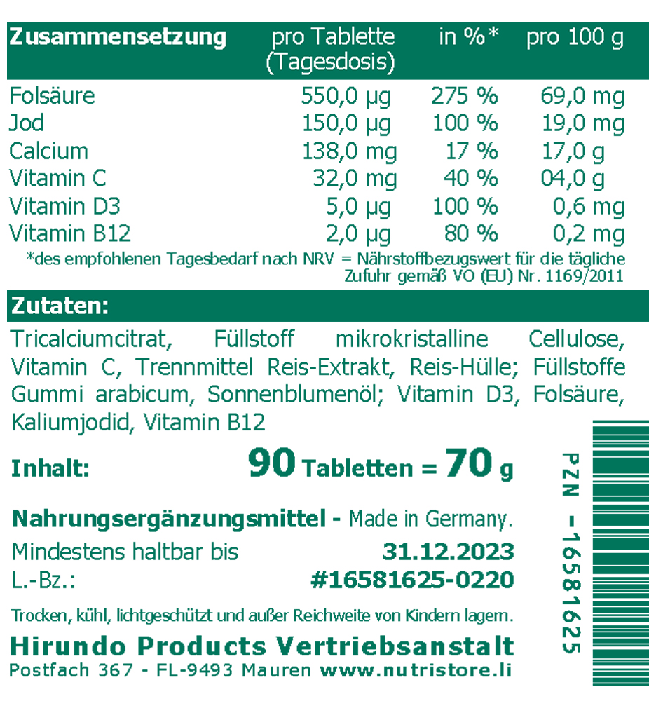 Zutaten: Tricalciumcitrat, Füllstoff mikrokristalline Cellulose Vitamin C, Trennmittel Reis-Extrakt, Reis-Hülle; Füllstoffe Gummi arabicum, Sonnenblumenöl; Vitamin D3, Folsäure,Kaliumjodid, Vitamin B12