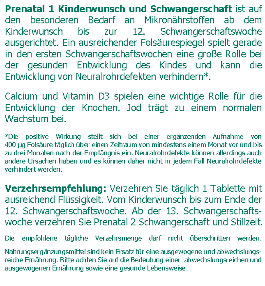 Prenatal 1 Kinderwunsch und Schwangerschaft ist auf den besonderen Bedarf an Mikronährstoffen ab dem Kinderwunsch bis zur 12. Schwangerschaftswoche ausgerichtet. Ein ausreichender Folsäurespiegel spielt gerade in den ersten Schwangerschaftswochen eine große Rolle bei der gesunden Entwicklung des Kindes und kann die Entwicklung von Neuralrohrdefekten verhindern*.
