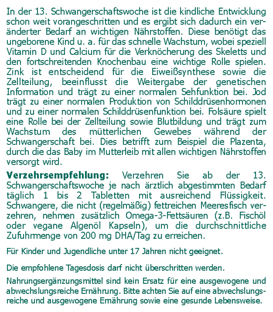 Verzehrempfehlung: Verzehren Sie ab der 13. Schwangerschaftswoche je nach ärztlich abgestimmten Bedarf täglich 1 bis 2 Tabletten mit ausreichend Flüssigkeit. Schwangere, die nicht (regelmäßig) fettreichen Meeresfisch verzehren, nehmen zusätzlich Omega-3-Fettsäuren (z.B. Fischöl oder vegane Algenöl Kapseln), um die durchschnittliche Zufuhrmenge von 200 mg DHA/Tag zu erreichen.