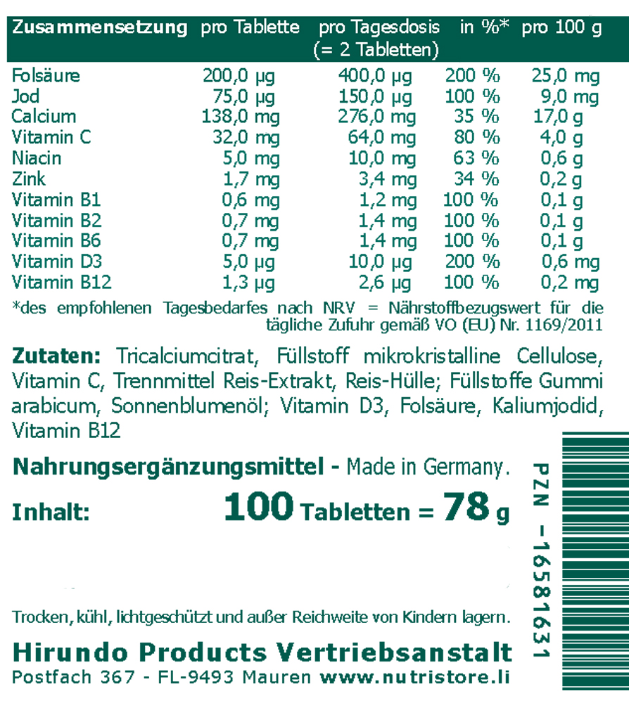 Zutaten: Tricalciumcitrat, Füllstoff mikrokristalline Cellulose, Vitamin C, Trennmittel Reis-Extrakt, Reis-Hülle; Füllstoffe Gummi arabicum, Sonnenblumenöl; Vitamin D3, Folsäure, Kaliumjodid, Vitamin B12