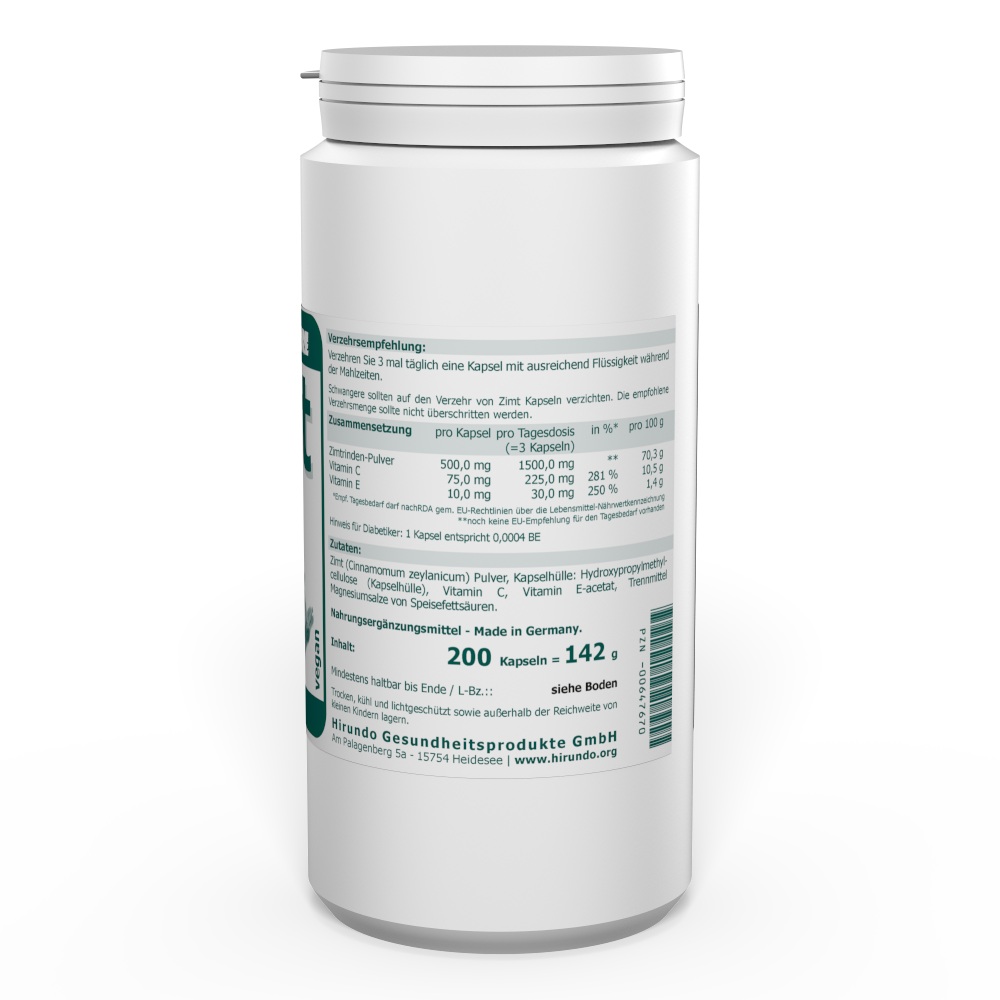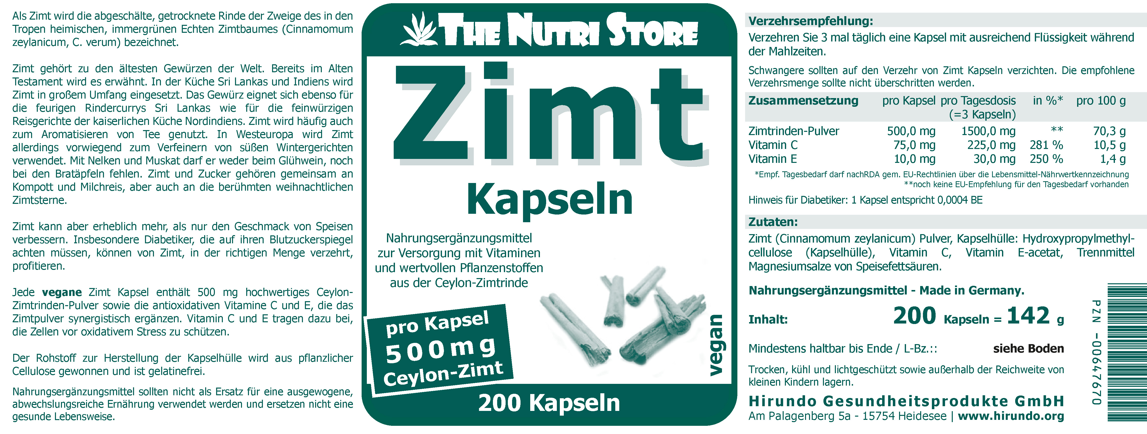 Zutaten: Zimt (Cinnamomum zeylanicum) Pulver, Kapselhülle: Hydroxypropylmethylcellulose, Vitamin C, Vitamin E-acetat, Trennmittel Magnesiumsalze von Speisefettsäuren